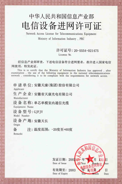单芯单模室内通信光缆获中华人民共和国信息产业部进网许可证